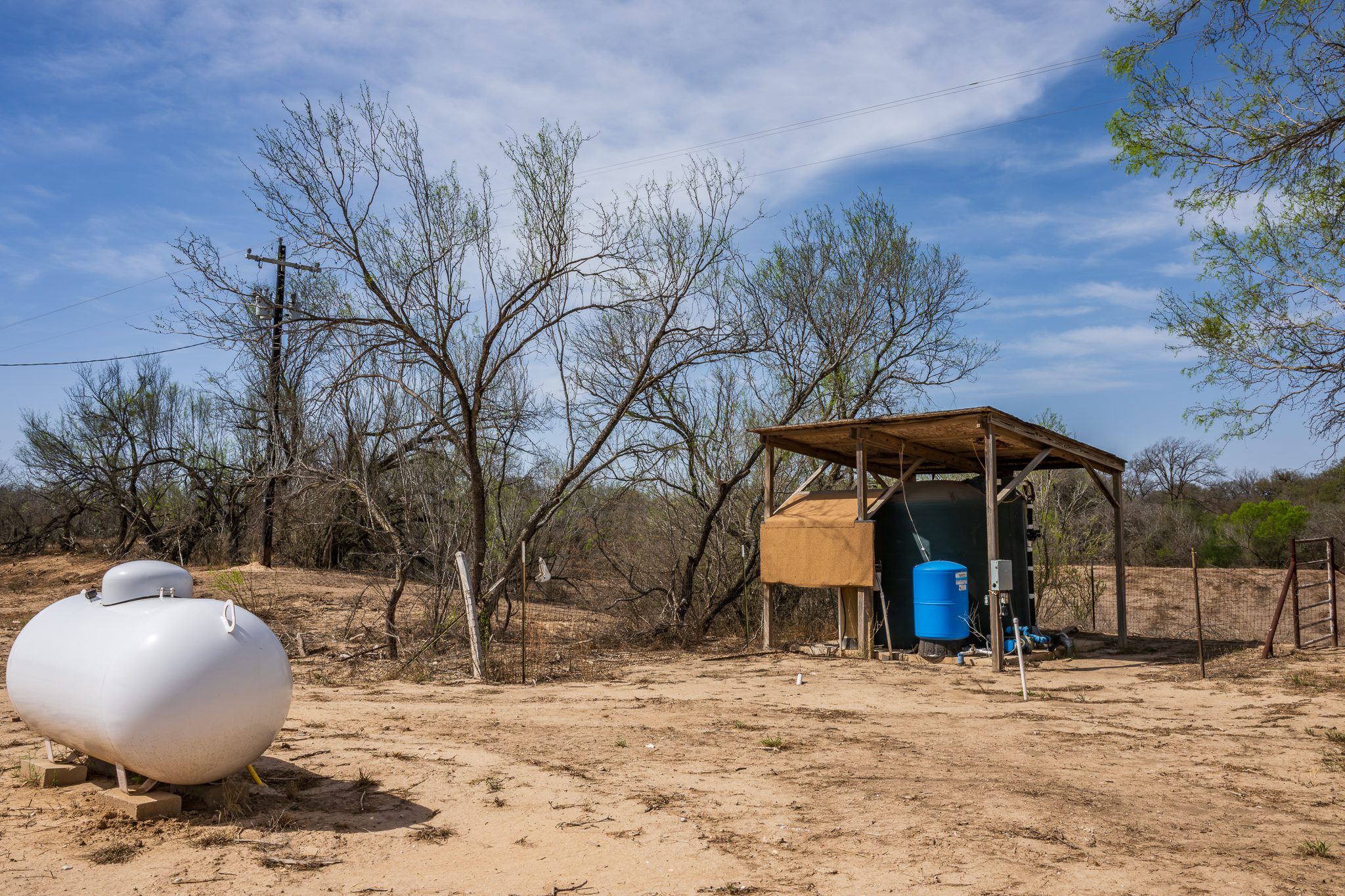The property features 3-phase power on site and a Carrizo water well drilled in 2023. The well is equipped with a 15 HP pump and produces approximately 76 gallons per minute. A 2,500-gallon