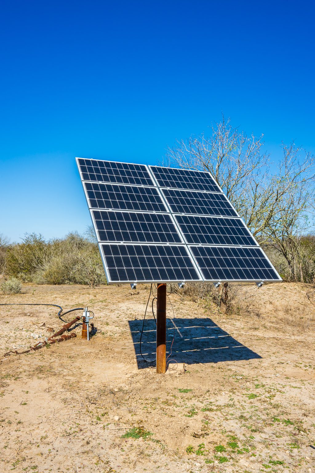 Water for the ranch is supplied by a quality water well drilled in 2018 to an approximate depth of 345 feet, featuring a 4″ PVC casing with the pump believed to be set at around 145 feet. In addition to the primary well, the ranch includes two older oil wells that have been converted for water use, expanding water availability across the property. One of these converted wells operates with a solar-powered pump set at approximately 180 feet, providing reliable supplemental water for wildlife and ranch operations.