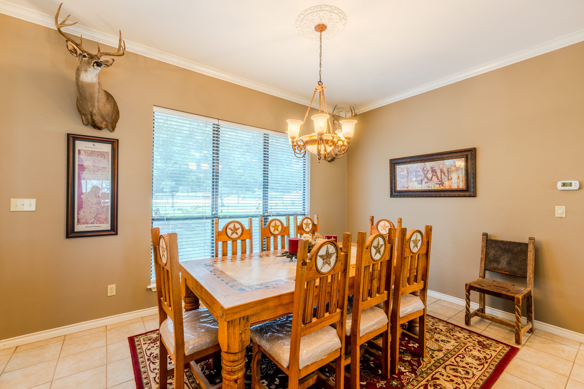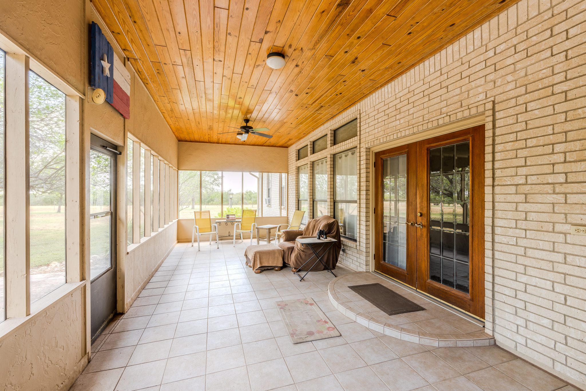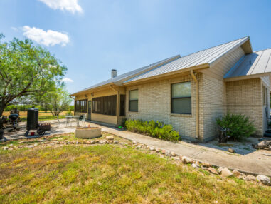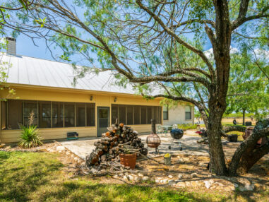 Improvements: The headquarters includes a single-story ranch-style home built in 2000. The house features three bedrooms, two bathrooms, and approximately 2,258 sq. ft. of living space. Inside, an open living and dining area with 10-foot ceilings is anchored by a wood-burning rock fireplace. The kitchen includes an island with a dining/breakfast bar, offering both function and space for gathering. Just off the main living area, a 431 sq. ft. screened-in porch provides a quiet spot to enjoy the outdoors and overlooks a landscaped patio.