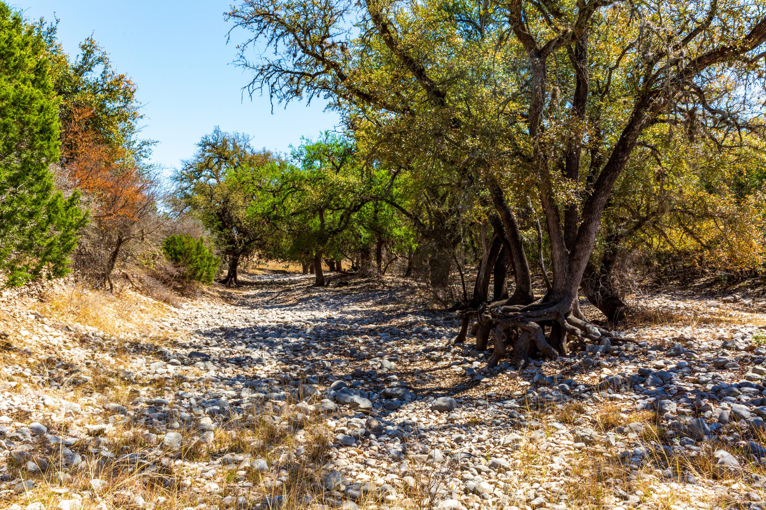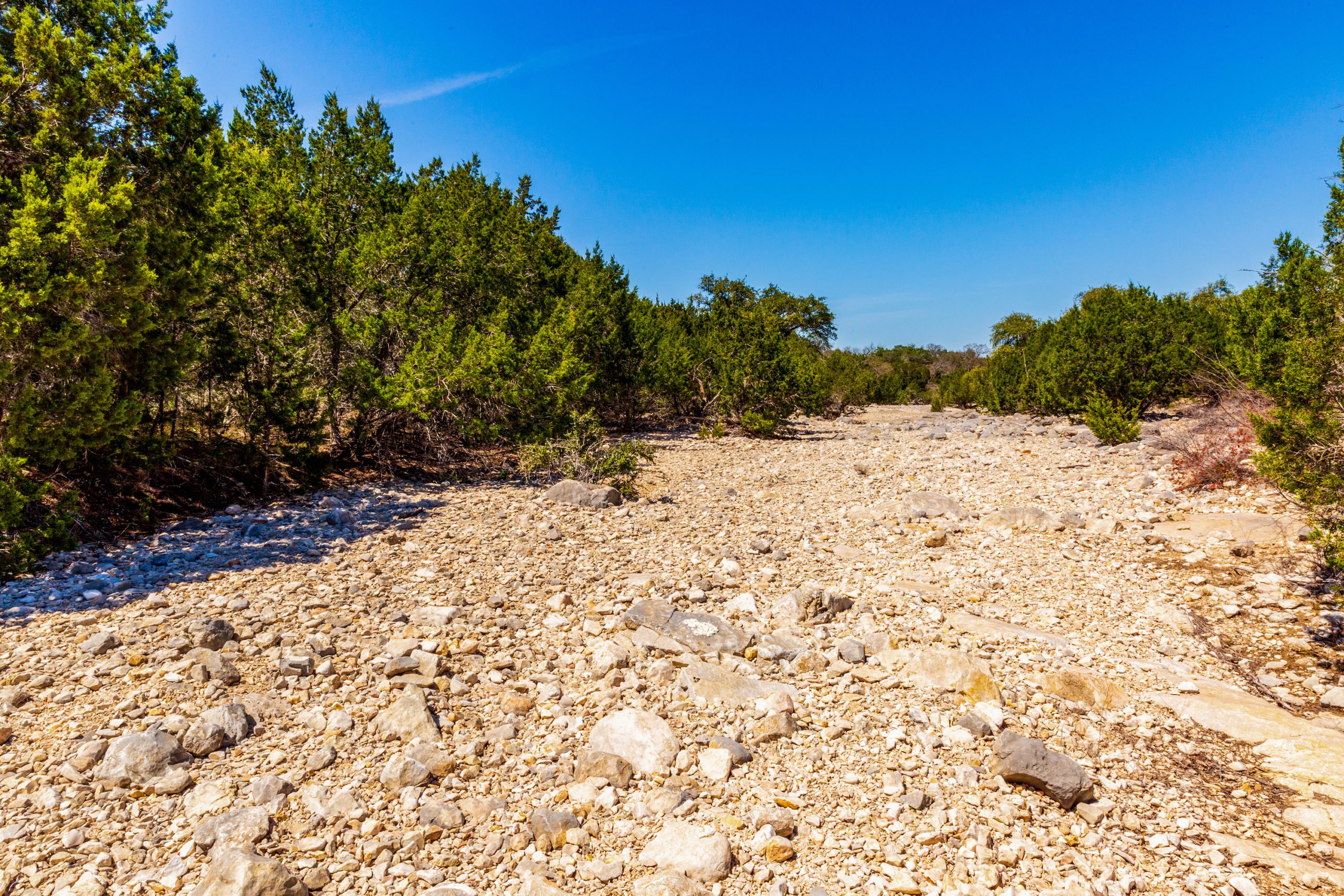 Vegetation: Lining the creek, there is a nice mixture of mature trees. As you climb elevation, you’ll find rockier ground with cedar trees. In the lower areas, there is some excellent soil with regrowth mesquite trees.